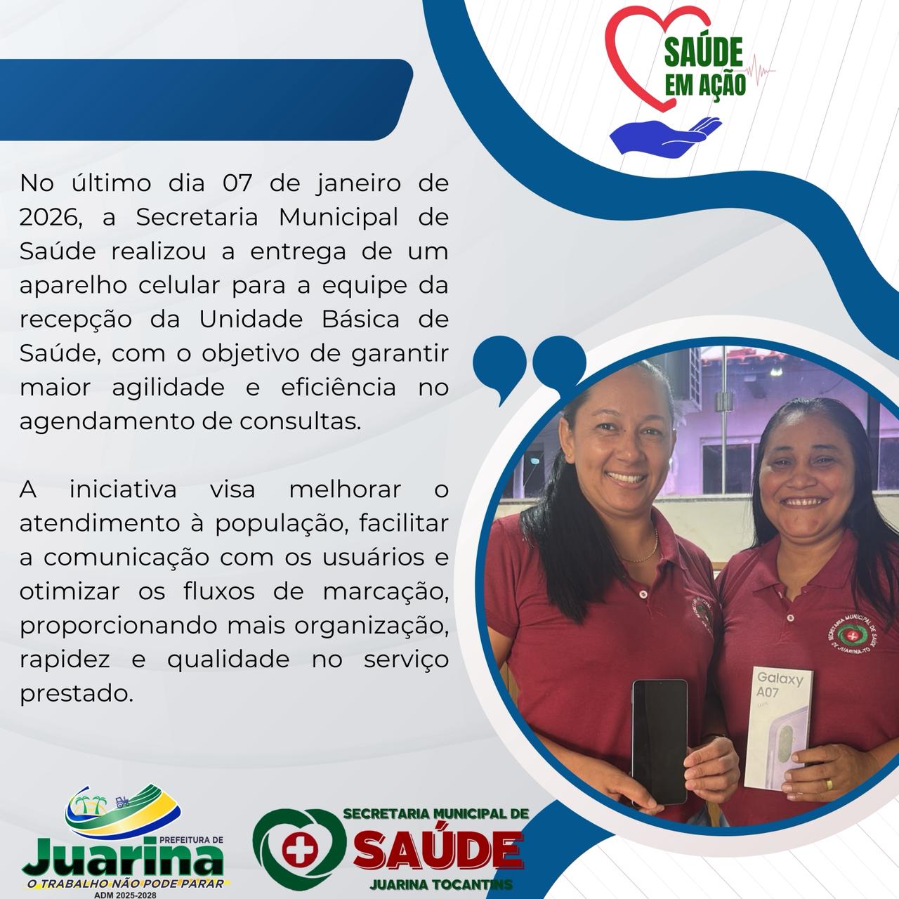 A Prefeitura Municipal de Juarina por meio da Secretaria Municipal de Saúde entrega um celular novo para equipe da recepção da Unidade Básica de Saúde. A aquisição vem garantir mais agilidade nos atendimento aos usuários do SUS, bem como fortalecer a comunicação entre pacientes e a UBS do município.